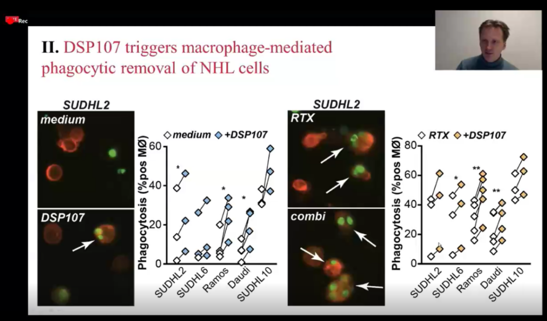 ①DSP107单药或联合利妥昔单抗对DLBCL细胞系或来源于患者体内的DLBCL细胞均能发挥吞噬作用。