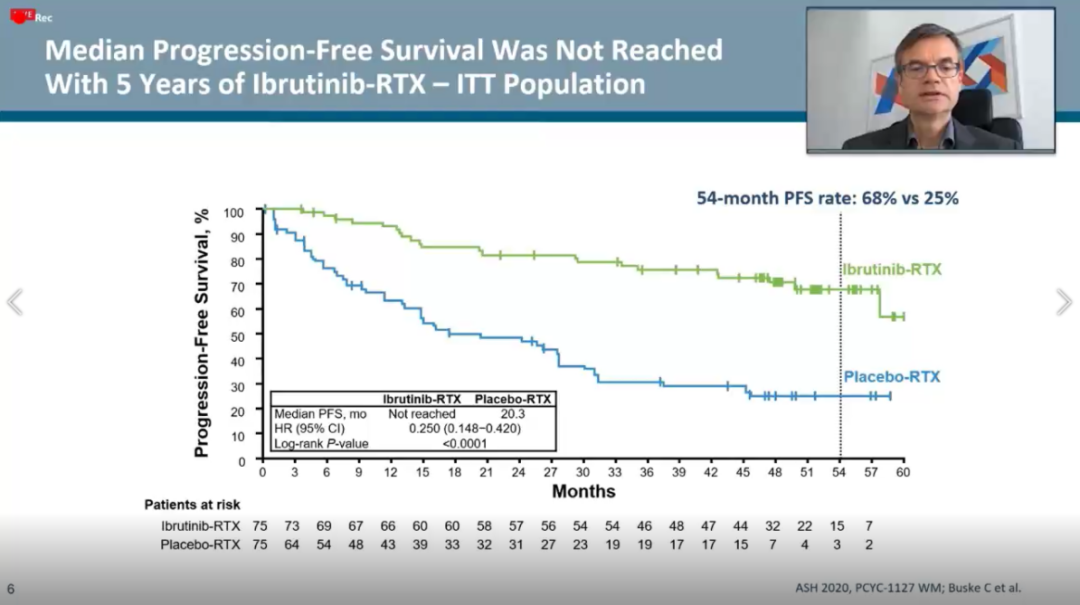 ①在无进展生存(PFS)方面,伊布替尼+利妥昔单抗(IR)方案组的中位PFS尚未达到(NR),安慰剂+利妥昔单抗组的中位PFS为20.3月(HR=0.25,95%CI:0.15~0.42; p<0.0001)。在第54个月时的PFS分别为68%(IR)vs 25%(安慰剂+R)。