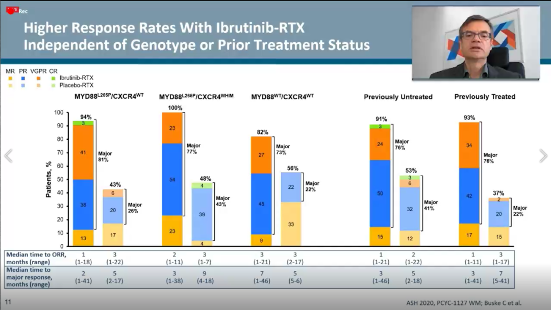 ②无论患者既往接受治疗的情况、基因型(MYD88L265P/CXCR4WT; MYD88L265P/CXCR4WHIM ; MYD88WT/CXCR4WT)及基线特征如何,亚组分析显示,IR方案较之于安慰剂+R方案组而言均能带PFS的优势。