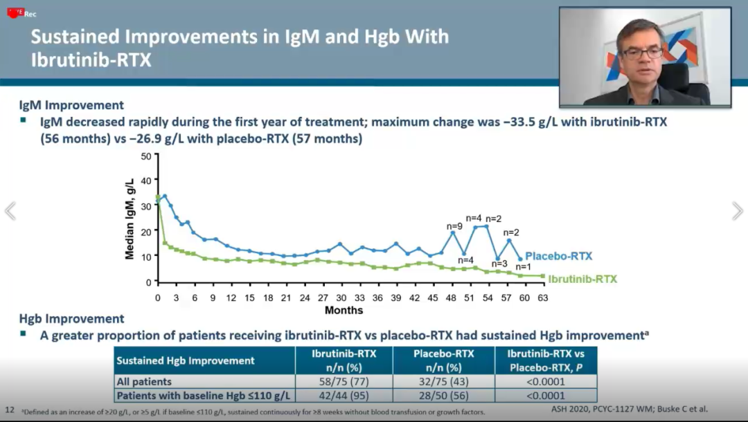 华氏巨球蛋白血症是一种少见的惰性淋巴细胞,致病原因是带有浆液细胞分化的粒细胞产生肿瘤性病变,产生许多血清单克隆IgM(浆液型),表现为贫血、出血、内脏侵犯、神经系统损害、肾功能损害等。既往临床上对于这类患者采用R-CHOP方案进行治疗,但对降低IgM蛋白水平和改善贫血情况有限,因此研究人员一直以来都在试图寻找更有效方案。自BTK抑制剂出现以来,有研究指出,将伊布替尼应用于早期WM患者显示出治疗前景,但长期获益究竟如何?本次ASH会议上的iNNOVATETM 5年随访数据给了我们一个很好的答案。从疗效看结果来看,治疗组PFS直至发表为止仍未达到,但对照组来看PFS仅有2年。在第54个月时治疗组PFS率仍有68%,安慰剂只有25%。更重要的是在亚组分析中所有不同突变的患者均有获益。而在改善贫血方面,伊布替尼也显示出了显著的疗效(77%),我相信随着更长期的随访观察和进一步成熟的数据的公布,很快伊布替尼联合利妥昔单抗的治疗方案将会被所有医生接受,成为治疗WM患者新的标准方案。