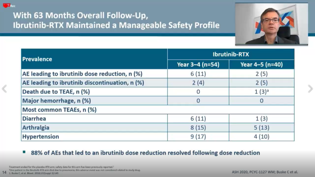 在安全性方面:研究中最常见的3~4级不良事件(AEs)包括房颤(16%)、高血压(15%)、中性粒细胞减少症(13%)、贫血(12%)。需要指出的是,无患者因不良事件导致伊布替尼停药。