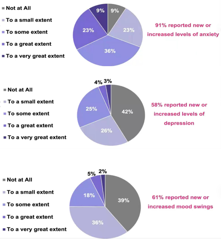 在回答诊断史问题的184例患者中,54例(30%)有导管原位癌/ADH(不典型导管增生)/LCIS(小叶原位癌)病史,94例(51%)有浸润性乳腺癌病史,6例(3%)患有妇科恶性肿瘤病史,30例(16%)回答“其他”。由于COVID-19大流行,有121例患者(58%)报告称她们的肿瘤内科就诊被取消、延迟或从现场就医改为视频远程医疗。156例接受内分泌治疗或化疗的受访者中,有26例(17%)报告说她们的治疗被取消或推迟。作为大流行的结果,分别有186例(91%)、110例(57%)和119例(60%)患者报告了新的或增加的焦虑、抑郁和情绪波动。少数患者(n=39,19%)认为COVID-19大流行对他们的癌症治疗产生了负面影响,大多数(n=151,73%)认为在大流行期间提供癌症护理的变化对她们最有利(部分或非常同意)。