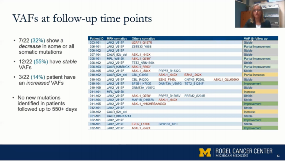 有效性方面:在第12周所有可评估总症状评分(TSS)的32例患者中,78%(25例)有TSS评分改善,其中25%(8例)TSS减少≥50%;在第12周入组2b期的14例患者中,86%(12例)出现脾脏体积的减少,14%(2例)脾脏体积减少≥35%,29%(4例)脾脏体积减少≥20%,没有转化为AML的病例。对22例患者49个不同变异等位基因频率(VAF)进行连续追踪,VAF降低32%,稳定55%。与CALR和MPL相比,JAK2突变的细胞对治疗更敏感;ASXL1突变的克隆对IMG-7289的敏感性最高。所有患者均未发现新的突变。
