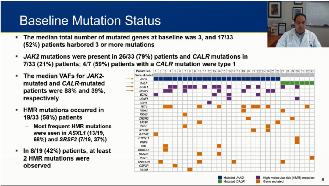 MF(骨髓纤维化)是一种主要由JAK/STAT信号驱动的骨髓增殖性肿瘤,伴随着生长转录因子、炎性因子、抗凋亡蛋白BCL-XL等的增加。很多患者在JAK抑制剂治疗后复发,长期有效药物有限;具有高分子风险(HMR)突变(定义为ASXL1、SRSF2、EZH2、U2AF1和IDH1/2突变)的MF患者的总生存期缩短和/或白血病转化风险也同时会增加增加。在对芦可替尼失去反应的骨髓纤维化(MF)患者中,navitoclax和 芦可替尼 (NCT03222609)的联合应用,在不再受益于 芦可替尼的MF患者中,可诱导有临床意义的脾脏体积(SVR)应答、总症状评分(TSS)改善和骨髓纤维化(BMF)分级降低。但这些与VAF减少与HMR突变的存在和突变的基因数量无关。正在进行的细胞因子分析表明,navitoclax+ 芦可替尼联合应用可能在改善关键细胞因子方面发挥作用,这些细胞因子参与了单纯 芦可替尼反应不佳的MF患者TSS的改善。