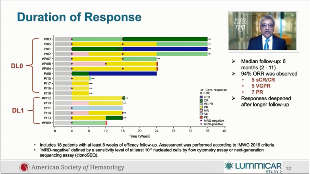但是,在疗效提升方面最显著的仍属免疫治疗,主要包括两大类,一类是CAR-T治疗,另一类是双特异性抗体。在今年的ASH大会上更新了【5】bb2121长期随访的结果,其疗效令人兴奋。KarMMa研究显示bb2121的疗效持久,对于绝大部分(70%-80%)患者有疗效,中位缓解持续时间超过1年,中位无进展生存(PFS)为9-10个月,我们期待缓解持续时间能更长,但考虑到这些MM患者在既往平均接受了5-6线治疗,并且对现有的药物治疗不敏感,bb2121能取得这样的疗效已经是非常不错的了,因此bb2121正接近获得FDA的上市批准。
