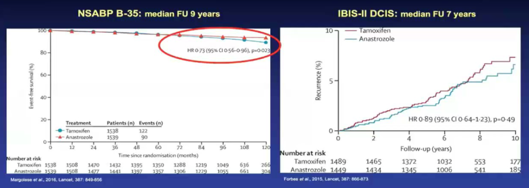 对于绝经后DCIS术后患者辅助内分泌治疗芳香化酶抑制剂(AI)是否优于他莫昔芬?2016年公布的IBIS-Ⅱ和NSABP B-35研究回答了这一问题,NSABP B-35 试验随访9年的数据提示:对于年龄小于60岁的绝经后HR+DCIS患者,5年的阿那曲唑辅助内分泌治疗较他莫昔芬具有更好的疗效,但≥60岁亚组中未观察到阿那曲唑的优势,同时在药物的选择时要兼顾患者对不良反应的耐受性。IBIS-Ⅱ试验是在接受过切除术的绝经后原位导管癌患者中,比较阿那曲唑和他莫昔芬在乳腺癌复发方面的预防作用,随访7.2年数据显示阿那曲唑疗效不劣于他莫昔芬,未显示出阿那曲唑的优势。