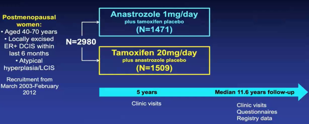 方法:对2003年至2009年间诊断为局部切除的DCIS的绝经后妇女进行了一项为期5年的多中心随机试验,分别接受阿那曲唑1mg/天(N=1471)和他莫昔芬20mg/天(N=1509)。本试验的主要目的是确定阿那曲唑与他莫昔芬在预防复发方面的疗效,尤其是在5年治疗后的随访期间。次要终点包括复发类型、乳腺癌死亡率、其他癌症、心血管疾病、骨折、不良事件和非乳腺癌死亡。