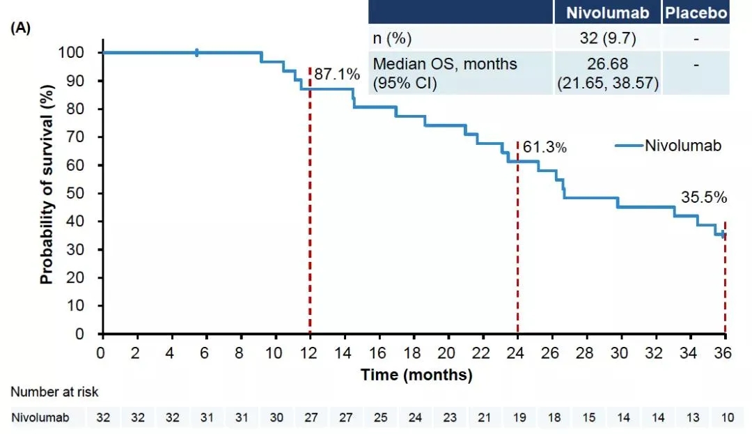 ◆ 更长生存期,1年生存率翻倍:3年随访结果显示,纳武利尤单抗组相比安慰剂组可使死亡风险降低38%,1年OS率翻倍(27.3% vs 11.6%),且OS获益优势在2年、3年随访中继续保持(10.6% vs. 3.2%;5.6% vs. 1.9%);