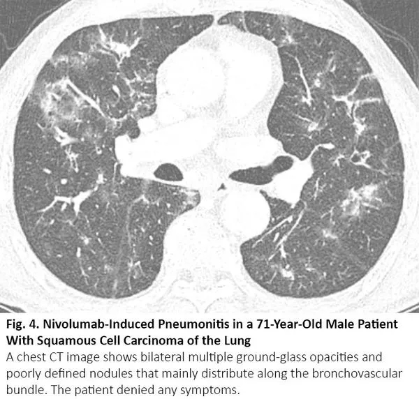 图4. 一位71岁肺鳞癌男性患者出现纳武利尤单抗治疗导致的肺炎