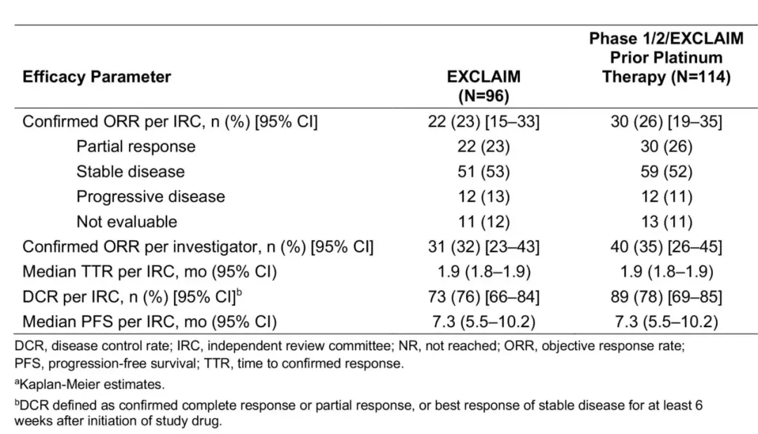 PFS:IRC评估的中位PFS为7.3个月,12个月PFS率为33% (95% CI: 21%-47%);