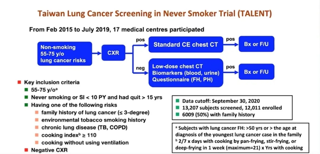 杨泮池教授(Pan-Chyr Yang)报告的TALENT研究是中国台湾开展的大型肺癌筛查研究,以从不吸烟者为对象(TALENT: Taiwan lung cancer screening for Never smokers Trial),旨在开发一种有效的从不吸烟者肺癌筛查策略,并建立风险预测模型。WCLC汇报了第一轮(T0)的结果。