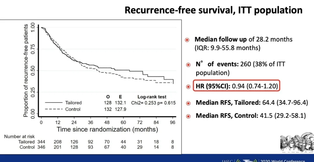 无复发生存期(RFS):对照组为41.5个月(29.2-58.1),定制组为64.4个月(34.7-96.4);风险比(T组vs. C组)为0.94 (95%CI: 0.74~1.20; p=0.615);