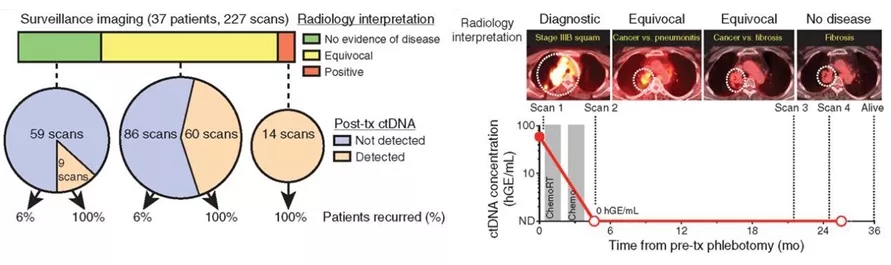 该研究纳入了40例经过根治性手术切除的I-III期肺癌患者及54例健康人群作为对照,采用基于肿瘤个体化的深度测序(cancer personalized profling by deep sequencing,CAPP-seq),分析了入组患者的255份ctDNA标本,动态监测37例治疗前ctDNA阳性肺癌患者的术后ctDNA变化。结果表明ctDNA检测阳性可早于约72%的影像学诊断的肿瘤复发,中位提前诊断时间为5.2个月。入组患者的227例患者的影像学报告中,无疾病复发组和需要鉴别诊断组分别有9份、60份报告有同期血浆检测ctDNA阳性,且均出现疾病复发。由此可见,ctDNA可以作为术后影像学检查之外有效的更早诊断手段。