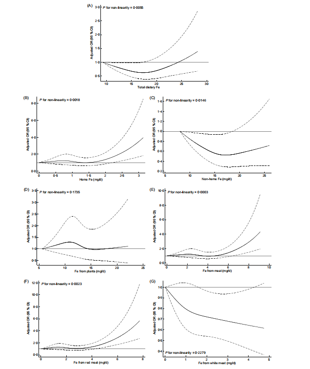△膳食摄入的总铁(A)、不同形式的铁(B和C)和不同来源的铁(D、G),多变量调整的OR(黑色实线)和95%CI(虚线)来判断乳腺癌风险。最低摄入量设置为参考(灰色实线)(OR = 1.00)