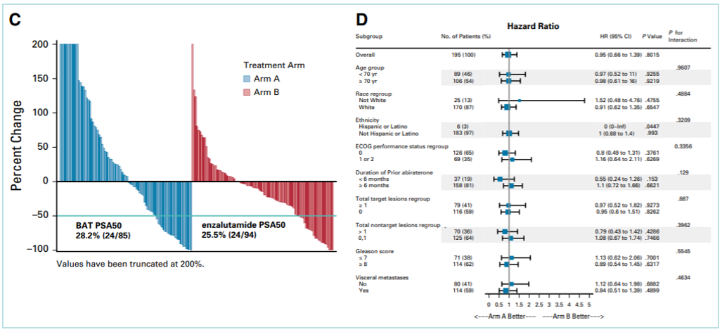 BAT组和恩扎卢胺组的PSA50缓解率(PSA下降50%的患者比例)无显著差异,分别为28.2%和25.3%;但恩扎卢胺组的PSA-PFS优于BAT组(2.8 vs 3.8个月;HR 1.51,95%CI:1.06~2.16;P=0.02),而BAT组的ORR高于恩扎卢胺组(24.2% vs 4.2%,P=0.07)。