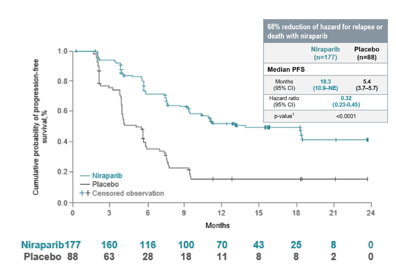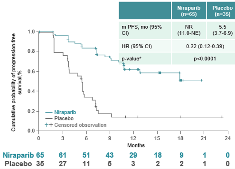研究结果显示,接受尼拉帕利治疗使总人群中疾病进展或死亡风险降低了68%。相较安慰剂组,接受尼拉帕利治疗显著延长了患者中位无进展生存期(PFS),18.3个月对比5.4个月。gBRCA突变患者PFS获益更加显著,尼拉帕利组目前仍未达到中位PFS值,安慰剂组为5.5个月 ;无gBRCA突变亚组,尼拉帕利组对比安慰剂组PFS也有显著延长,11.1对比 3.9个月。此外,个体化起始剂量治疗方案降低了治疗后出现的血液学不良事件的发生率。接受尼拉帕利治疗组和安慰剂组的患者中,3级或更高级别的血液学不良事件如中性粒细胞计数降低事件、贫血事件和血小板计数降低事件的发生率分别为20.3%比8.0%,14.7%比2.3%,11.3%比1.1%。