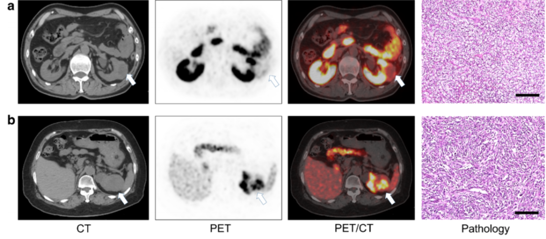 图1:影像-病理匹配案例。a. 最大径4.3 cm, WHO/ISUP 1级, pT1b; b. 最大径4.4 cm, WHO/ISUP 4级, pT1b