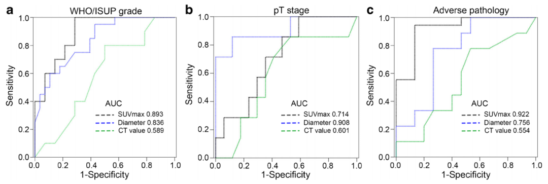结论:68Ga-PSMA-11 PET/CT图像参数可以有效地区分肾透明细胞癌的恶性病理特征(WHO/ISUP等级和不良病理特征)。