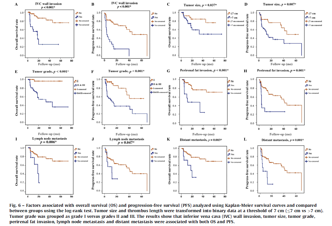 图7:下腔静脉壁浸润、肿瘤大小、肿瘤分级、肾周脂肪浸润、淋巴结转移和远处转移与OS和PFS均相关