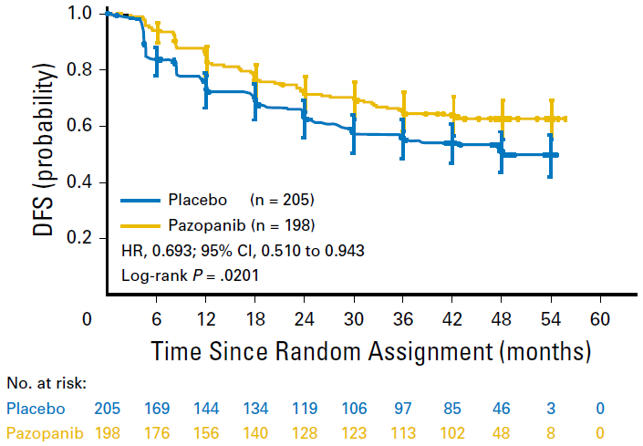 分组情况:初始剂量为800mg一天一次403例,其中Pazopanib组198例,安慰剂组205例。因为治疗中断率高于预期故将初始剂量由800mg调整为600mg一天一次1135例,其中Pazopanib组571例,安慰剂组564例。主要研究终点为Pazopanib 600mg的无疾病生存率disease-free survival, DFS,次要研究终点为总体生存率overall survival, OS以及生活质量评估。