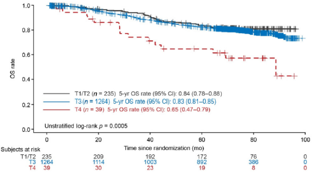 结果:主要研究终点OS,Pazopanib组和安慰剂组相比没有差异。OS在T4患者中最差,而相比于更低的BMI,在BMI≥30kg/m2患者中较好。OS在术后两年内无复发人群中好于两年内复发人群。