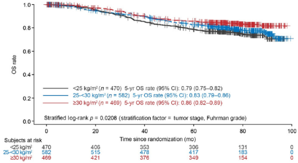 其次,在OS方面,发现了非常有趣的结果,BMI指数≥30kg/m2的肥胖人群OS更长,预后较好。虽然之前的研究提示肥胖和肾癌发生有正相关性,但是在手术之后复发转移方面,肥胖的人群反而比不肥胖的人群发生率更低,这使得我们在肾癌和脂肪代谢相关性方面需要更加深入的思考。
