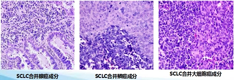 复合型小细胞肺癌(C-SCLC)的指小细胞肺癌(SCLC)与非小细胞肺癌(NSCLC)成分混合,其中NSCLC成分可以为鳞状细胞癌、腺癌、大细胞神经内分泌肿瘤、梭形细胞癌、巨细胞癌等,混合成分可以是一种或多种。复合型SCLC约占小细胞肺癌的10%,病理上表现为,小细胞肺癌成分中伴有数量不等的其他非小细胞癌成分(形态学上可区分)。临床特点表现约50%为周围性肺癌,局限期(I-II期)约占70%,相对于纯小细胞肺癌手术治疗获益大,对放化疗相对不敏感,对EGFR-TKI潜在有效。