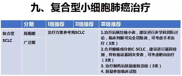 2021 版《CSCO小细胞肺癌诊疗指南》对于复合型SCLC的治疗,I级和II级推荐参考纯小细胞肺癌的方案;III级推荐中,对于治疗后病灶缩小者,建议多学科讨论,对于临床判断可切除者,考虑手术治疗;合并腺癌成分者,建议进行驱动基因检测,以判断能否进行靶向治疗;耐药后鼓励重复活检;鼓励患者参加临床试验。