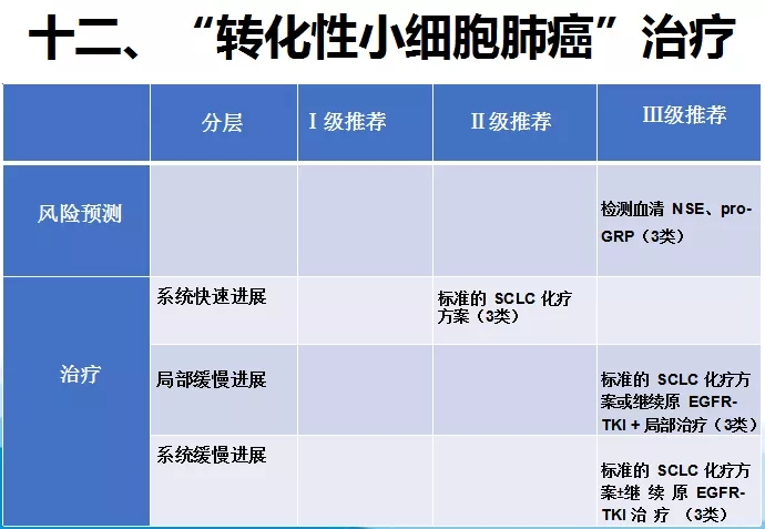 对于转化性SCLC的风险预测,应检测biomarker,包括检测血清NSE、pro-GRP。整体治疗策略方面,根据疾病进展情况分层治疗,对于系统快速进展的患者采取标准的SCLC化疗方案;局部缓慢进展的患者,采取标准的SCLC化疗方案或继续原来的EGFR-TKI+局部治疗;系统缓慢进展的患者,在化疗的基础上,参考原来的治疗方案。
