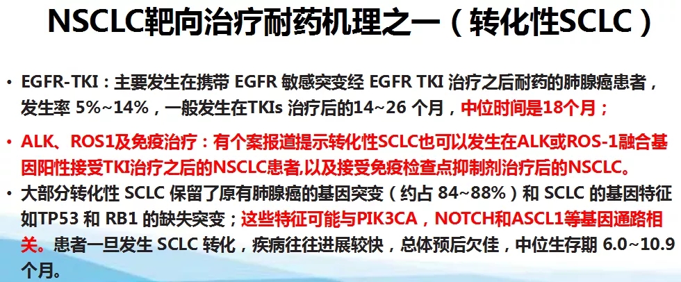 转化性SCLC与纯SCLC的治疗策略大有不同。经典小细胞肺癌的治疗是根据疾病分期进行治疗,而转化性SCLC是按照疾病进展的风险分层进行推荐,若疾病进展迅速,立刻进行化学治疗,化疗方案参考纯SCLC的化疗方案;临床局部或全身进展比较缓慢的情况,在化疗的基础之上,一定要加上原来的治疗方案,比如原来使用的EGFR-TKI,其中一些患者需要加局部治疗。