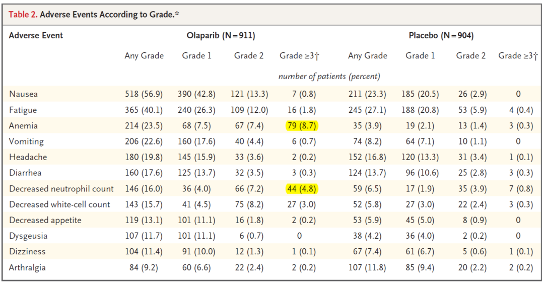 像其它药物一样,一种药物在晚期乳腺癌治疗领域取得成功后,通常会把“战场”前移到更广阔的早期乳腺癌领域,奥拉帕利也不例外。OlympiA研究将奥拉帕利的辅助目标人群锁定在“高危”的BRCA1/BRCA2胚系突变的HER2-乳腺癌,在标准系统治疗的基础上(辅助/新辅助),看看加上奥拉帕利(奥拉帕利300mg,一天口服2次,共1年,即52周)是否会锦上添花?今年ASCO会议,OlympiA研究公布了中位随访2.5年的战况。结果显示战果喜人,总体人群3年的iDFS绝对提高了8.8%,iDFS的发生风险降低42%(见图1)!更为关键的是毒副作用也挺好,≥3级毒副反应比较少,都低于10%,最高的≥3级毒副反应是贫血,为8.7%,≥3级的粒缺仅为4.8%(见图2)。下面,我们就来解读一下该研究对目前三阴乳腺癌辅助强化策略会产生什么影响。