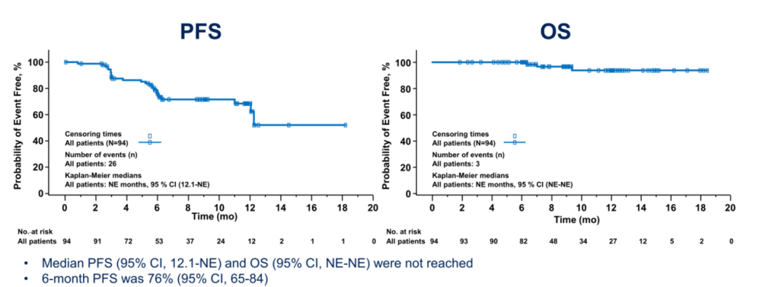 CRR为66%,ORR为86.2%,主要研究终点已经达到,中位DOR尚未达到,中位PFS及OS尚未达到。6个月PFS为76%(95%CI,65-84)。
