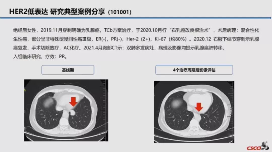 随后江泽飞教授分享了本研究中一例典型病例,该患者为绝经后HER2低表达患者,既往接受过TCb新辅助治疗、手术、放疗、AC化疗等,患者依然存在肺转移。在MRG002治疗4个周期后的影像评价效果良好,转移灶退缩。