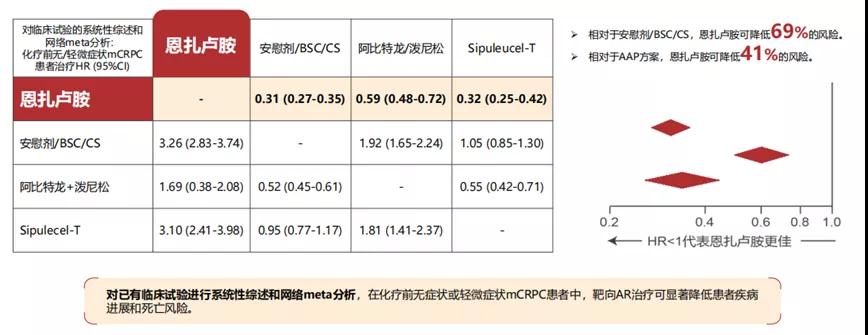 目前还没有头对头比较的研究,但已有一些基于临床研究数据的间接比较。2021年ASCO-GU报道的一项网络荟萃分析,比较了PROSPER、SPARTAN、ARAMIS和STRIVE等关键研究的数据显示,恩扎卢胺相较于比卡鲁胺、达罗他胺有显著的MFS和TTPP延长,但三种新型AR抑制剂的OS没有显著差异。