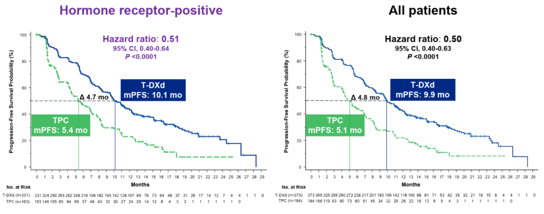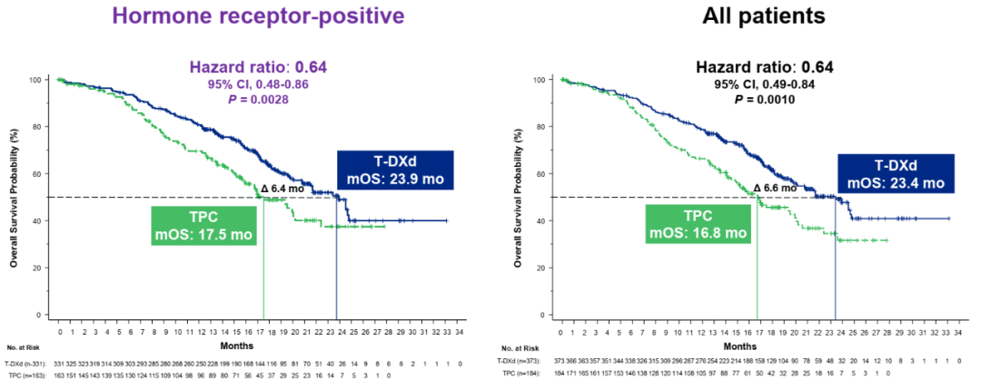在接受随机化的557例患者中,494例(88.7%)患有HR+疾病,63例(11.3%)患有HR-疾病。在HR+队列中,T-DXd组和医生选择组的中位无进展生存期分别为10.1个月和5.4个月(疾病进展或死亡的风险比为0.51;P<0.001),总生存期分别为23.9个月和17.5个月(死亡的风险比为0.64;P=0.003)。在所有患者中,T-DXd组和医生选择组的中位无进展生存期分别为9.9个月和5.1个月(疾病进展或死亡的风险比,0.50;P<0.001),总生存期分别为23.4个月和16.8个月(死亡的风险比,0.64;P=0.001)。