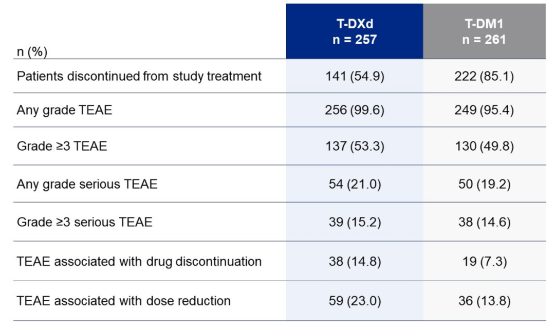 T-DXd组和T-DM1组的任何级别TEAE(99.6% vs 95.4%)、≥3级TEAE(53.3% vs 49.8%)、任何级别严重TEAE(21.0% vs 19.2%)、≥3级严重TEAE(15.2% vs 14.6%)发生率相当,T-DXd略高于T-DM1。T-DXd组和T-DM1组的停药率分别为14.8%和7.3%,减药率分别为23.0%和13.8%。