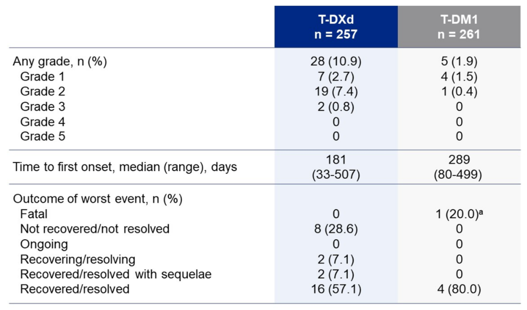 从上次DCO以来,T-DXd组新增了1例2级ILD/非感染性肺炎事件。更新的数据显示,T-DXd组和T-DM1组的任何级别ILD/非感染性肺炎发生率分别为10.9%和1.9%,但两组中大部分均为1/2级,T-DXd组中有2例为3级,没有4/5级ILD/非感染性肺炎发生。T-DXd组和T-DM1组的中位至首次发生ILD/非感染性肺炎时间分别为181天和289天。两组中大部分患者的ILD/非感染性肺炎已经或正在康复(71.3% vs 80%),T-DXd组有8例(28.6%)没有康复,而T-DM1组有1例(20%)因ILD/非感染性肺炎发生死亡。
