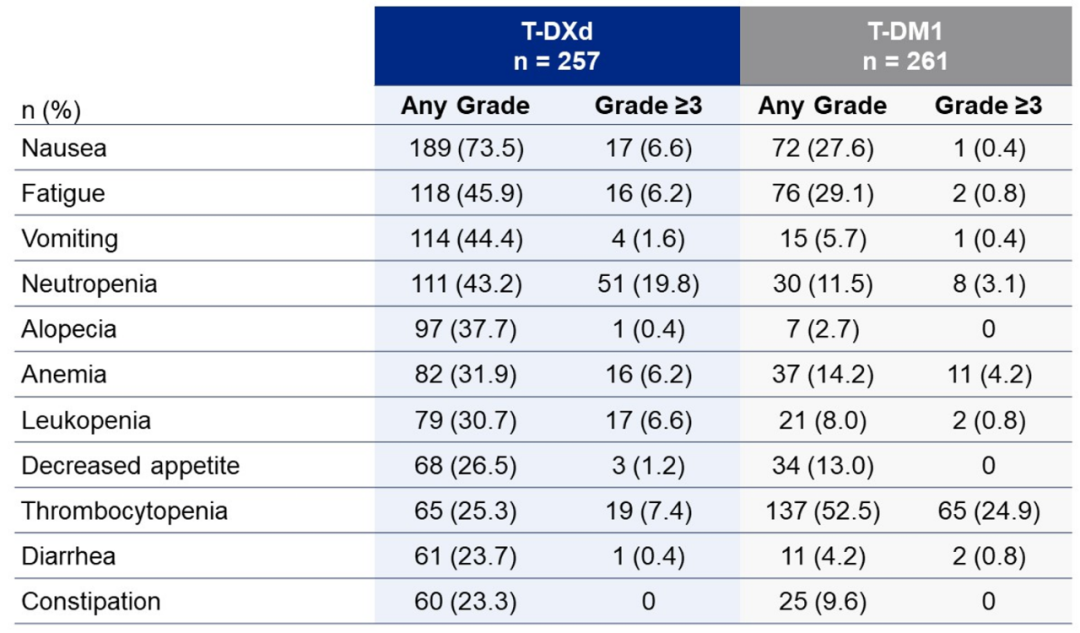 T-DXd组的至首次发生停药相关TEAE(224 vs 147天)、减药相关TEAE(96 vs 19天)的时间均比T-DM1组更加延迟。其中T-DXd组的至首次发生贫血(70 vs 42天)、粒细胞减少(196 vs 168天)、血小板减少(132 vs 8天)、呕吐(10 vs 6天)的时间均比T-DM1组更加延迟。