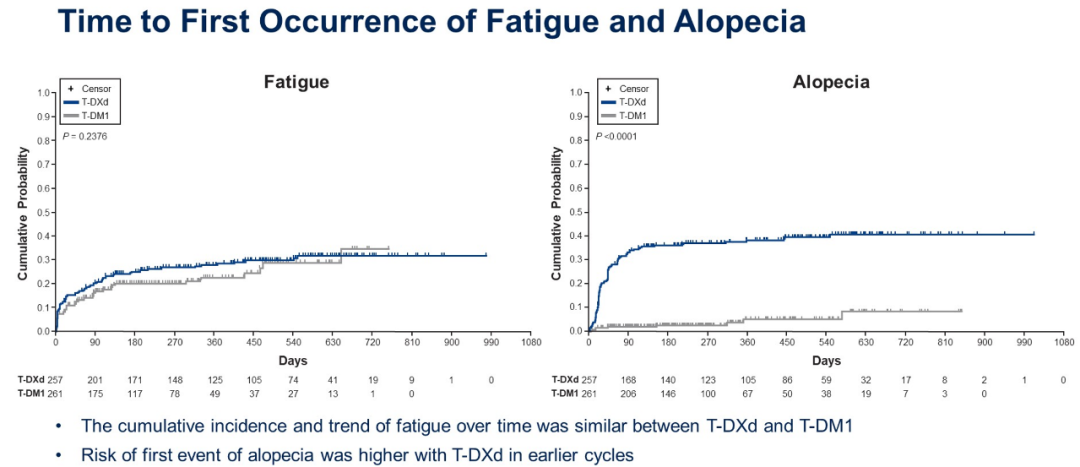 T-DXd治疗患者的首次恶心、呕吐、乏力、脱发主要发生在早期疗程;而且T-DXd组患者在早期疗程中发生恶心、呕吐、脱发的风险高于T-DM1,但乏力的累积发病率及趋势与T-DM1相似。