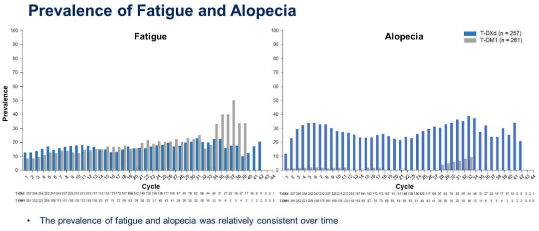 T-DXd组每个治疗周期的恶心、呕吐、脱发患病率高于T-DM1组,且这种差异在治疗全程中保持一致。大部分为1/2级事件且得到解决,仅有1例患者因呕吐而停药。T-DXd组和T-DM1组的乏力患病率相似,治疗过程中基本保持一致。