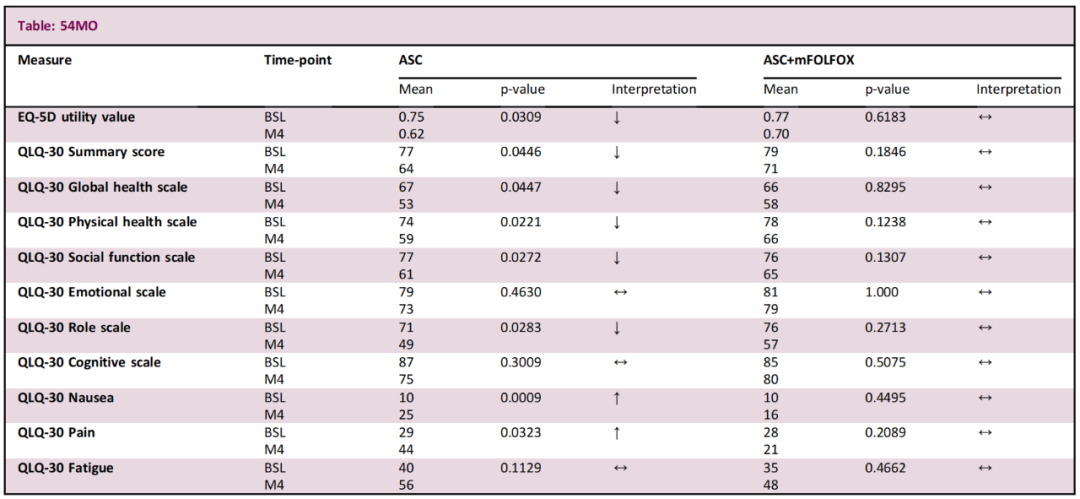研究结果:在随机的162例患者中,138例符合分析条件,其中ASC组65例,ASC+FOLFOX组73例。基线特征和自基线到第4个月的随访在2组间平衡良好。在ASC中加入FOLFOX化疗不会导致QoL参数恶化(见表1)。相比之下,ASC组患者出现EQ-5D效用值和大多数QLQ-30量表(包括整体、身体、社会和角色量表)评分的恶化。ASC+FOLFOX组的恶心和疼痛也出现恶化,但仍保持稳定。