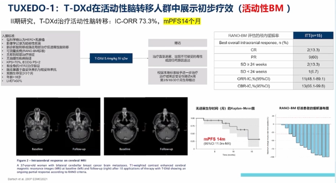 DEBBRAH研究是探索T-DXd在脑转移和/或脑膜转移的HER2+和HER2低表达晚期乳腺癌患者治疗有效性和安全性的单臂Ⅱ期研究,初步结果显示,T-DXd在活动性脑转移(经治后进展)人群的ORR为44.4%;TUXEDO-1研究是一项前瞻性的、开放的、单臂的Ⅱ期研究,对新诊断未接受过脑转移治疗、或脑转移经局部治疗后进展、或经曲妥珠单抗和帕妥珠单抗治疗后无立即进行局部治疗条件的HER2阳性乳腺癌脑转移患者应用T-DXd治疗的效果进行了探索,结果显示,对于脑转移活跃期的HER2阳性乳腺癌,T-DXd有着良好的治疗效果,RANO-BM评估的ORR可达73.3%,mPFS达到了14个月。本届ESMO大会上公布的相关研究数据显示,患者的总体健康状况良好,对于HER2阳性活动性脑转移患者,经T-DXd治疗后,患者的生活质量和神经认知功能均有较好的维持。