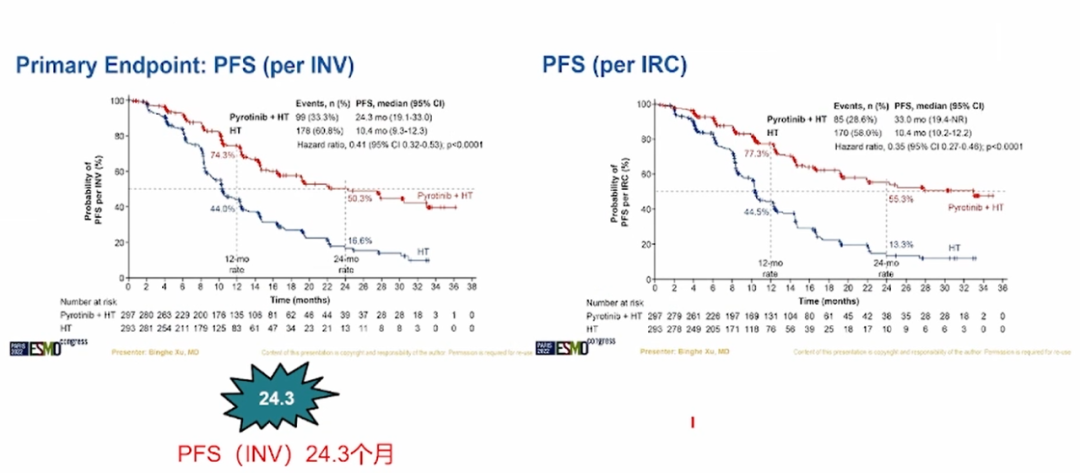 截至2022年5月,吡咯替尼组与对照组的中位随访时间分别为15.8个月和14.9个月,两组患者经研究者评定的中位PFS分别为:24.3个月(95%CI:19.1~33.0)vs 10.4个月(95%CI:9.3~12.3),HR 0.41(95%CI:0.32~0.53),P<0.0001。经独立评审委员会评定的中位PFS分别为:33.0个月(95%CI:19.4~NR)vs 10.4个月(95%CI:10.2~12.2),HR 0.35(95%CI:0.27~0.46),P<0.0001。吡咯替尼组的中位PFS显著长于对照组。