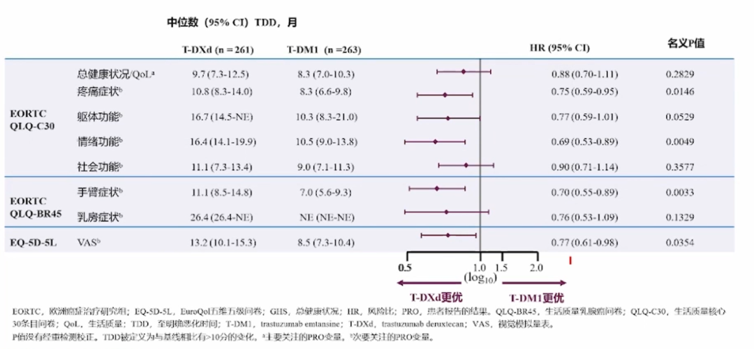 安全性方面,TEAE(任何等级和≥3级)和严重TEAE在T-DXd和T-DM1治疗组发生率相似。对研究中患者的暴露调整发病率(EAIRs)进行分析,结果显示EAIRs越低,暴露量校正后的相关的TEAE发生率越低,预示着更好的安全性。特别关注的不良事件中,T-DXd治疗组未发现有4级或5级不良事件的发生。DB-03研究的PRO数据显示,T-DXd显著改善患者疼痛症状及情绪功能。