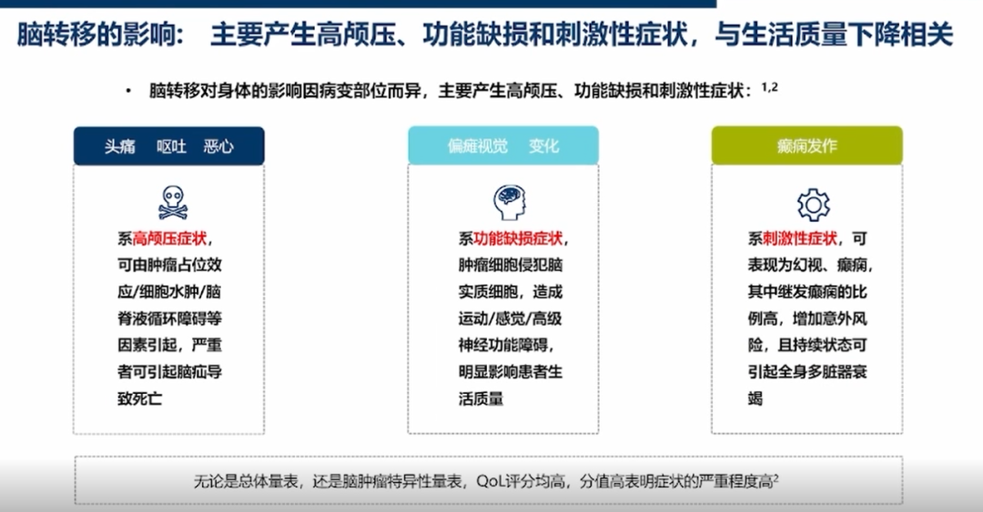 徐菲教授随后对脑转移带来的影响进行了介绍,她提到乳腺癌脑转移与患者的生存期缩短相关。脑转移患者主要产生高颅压、功能缺损和刺激性症状,与患者的生活质量下降相关。头痛、恶心、呕吐(高颅压症状)可能是脑转移患者的首发症状。其次,由于肿瘤细胞侵犯脑实质细胞,造成患者运动、感觉、高级神经功能者障碍,患者可能出现偏瘫视觉变化(功能缺损症状),明显影响患者的生活质量。幻视、癫痫等刺激性症状是临床医生最为担心的,也会对患者的生存造成影响。CSCO指南中推荐,对于HER2阳性脑转移的患者,局部症状可控的情况下,可以首先考虑抗HER2药物治疗。