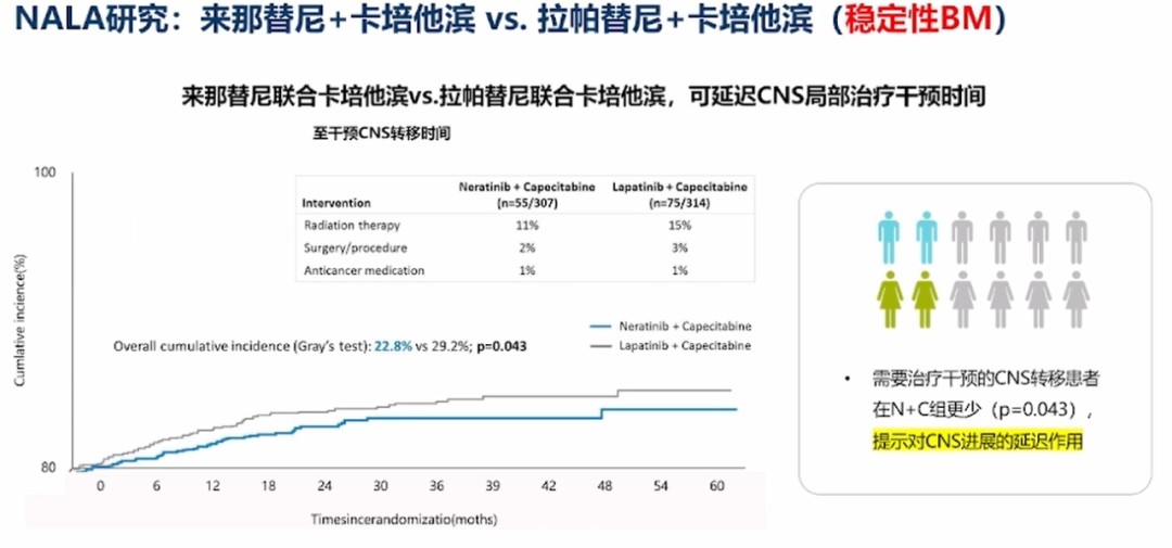 对于HER2阳性稳定性脑转移患者的治疗,TKI类药物、ADC药物都进行了相关探索。PHENIX是吡咯替尼联合卡培他滨对比卡培他滨单药治疗既往经曲妥珠单抗+紫杉治疗的HER2阳性晚期乳腺癌的Ⅲ临床研究,针对基线存在脑转移患者,吡咯替尼联合卡培他滨显示出了潜在疗效,mPFS可达6.9个月。NALA是评估来那替尼联合卡培他滨对比拉帕替尼联合卡培他滨疗效和安全性的临床研究,研究结果提示,来那替尼联合卡培他滨相较于拉帕替尼联合卡培他滨,可延迟出现有症状的CNS转移的时间。