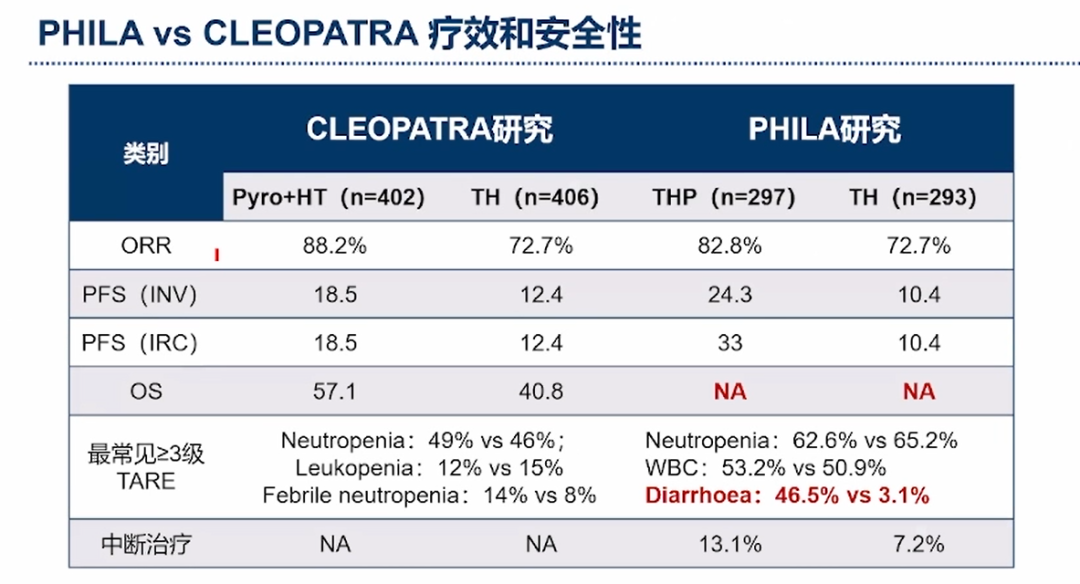 安全性方面,与既往报道的数据一致,未发现新的安全性信号。PHILA研究最常见的≥3级TRAE是中性粒细胞计数下降(62.6%vs 65.2%)、白细胞计数下降(53.2%vs 50.9%)和腹泻(46.5%vs 3.1%),3级腹泻主要发生在第1周期,第2周期及以后显著减少,未发生4级或5级腹泻,严重TRAE发生率分别为24.9%和6.1%,治疗相关死亡的发生率分别为0和0.3%。