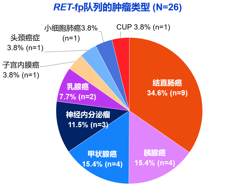 2022年8月,国际医学杂志《自然医学》(Nature Medicine)公布了I/II期ARROW试验(NCT03037385)中普拉替尼用于12种RET融合阳性肿瘤(不包括NSCLC和甲状腺癌)的疗效和安全性数据。[5]共计29例患者,其中23例患者最终被纳入疗效分析,包括胰腺癌4例,胆管癌、神经内分泌癌和肉瘤各3例,结直肠癌、头颈部癌症和小细胞肺癌各2例,胃癌、卵巢癌、胸腺瘤和未知原发灶各1例。20例患者的TNM分期为IV期,其他3例为III期。大多数患者(87%)既往接受过其他治疗。