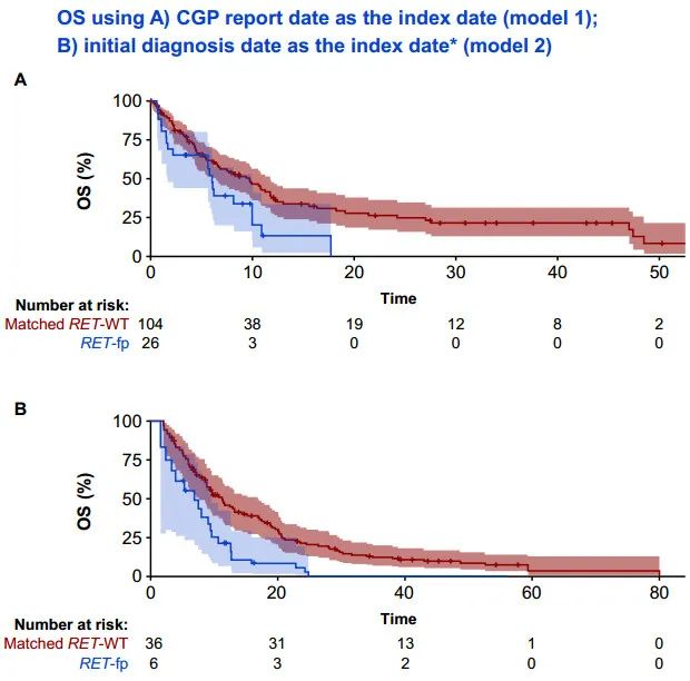 根据马氏距离法以4:1的比例匹配RET野生型和RET融合阳性患者,使匹配后的患者基线特征趋于一致和均衡。研究人员使用了两个模型对患者进行分析,预先选择的协同变量包括年龄、性别、种族、肿瘤类型、实践类型、ECOG PS评分、全面基因组分析(CGP)年份、从初次诊断到CGP报告日期的时间以及CGP报告之前的治疗线数。模型1以CGP报告日期为标签日期,模型2以转移诊断为标签日期。