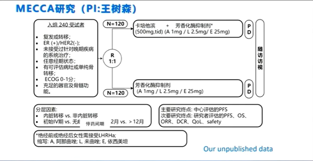近年来,节拍化疗与其他治疗联合的研究也逐渐成型,例如EORTC 75111-10114研究将节拍化疗与双靶治疗相结合,结果显示,联合节拍化疗对比单用靶向治疗6个月无进展生存率分别为73.4%和46.2%。另一项临床前研究发现,卡培他滨联合去乙酰化酶抑制剂西达本胺具有协同作用,因此,我们中心也在开展卡培他滨节拍化疗联合西达本胺用于二线及以上转移性三阴性乳腺癌的临床研究。此外,中山大学肿瘤防治中心也在开展一项节拍化疗联合内分泌治疗用于HR阳性晚期乳腺癌的MECCA研究,目前该研究入组已完成,正在进行后续随访。
